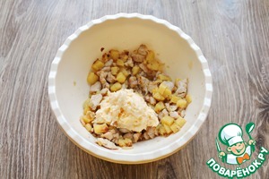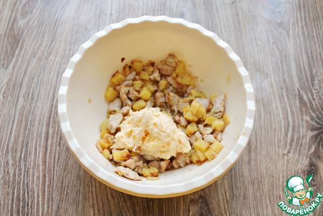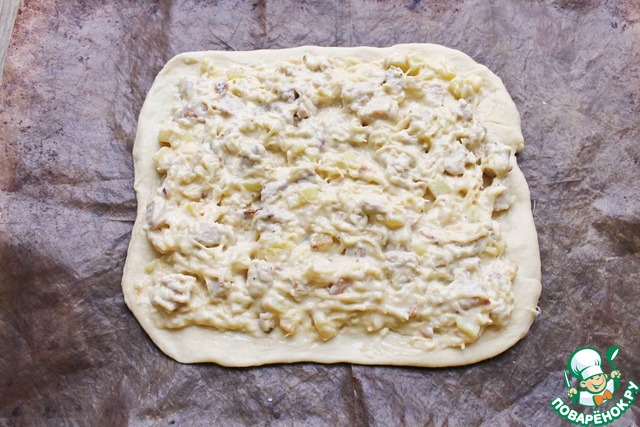 Пока подходит тесто, сделайте начинку. Для этого на растительном масле обжарьте порезанный репчатый лук в течение 5 минут. Добавьте порезанную куриную грудку и обжаривайте еще 5 минут. Отварной картофель порежьте кубиком и добавьте в сковороду, перемешайте и обжаривайте все 5 минут. Переложите начинку в миску, добавьте натертый на средней терке сыр, перемешанный с сырым яйцом и майонезом. Все посолите, поперчите и хорошо перемешайте.