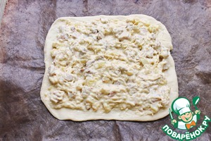 Подошедшее тесто разделите на 3 части. Одна часть маленькая для украшения, остальные части равные. Противень застелите бумагой для выпечки. Раскатайте одну большую часть и переложите на противень. Распределите на всю поверхность начинку ровным слоем.