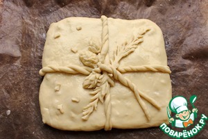 Сделайте из оставшегося теста украшения. Я сделала веревочки, как бы перевязала подарок. А так же скатала 3 конуса и при помощи обычных ножниц сделала шишки и сделала веточки. Смажьте верх перемешанным яйцом с молоком и оставьте на 20-25 минут в теплом месте для подъема.
