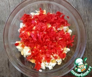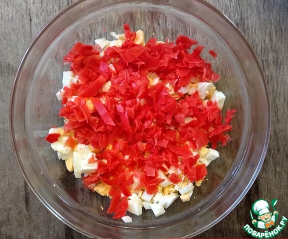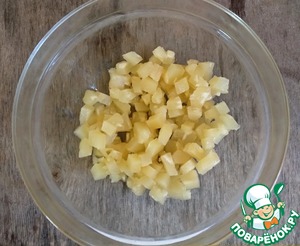 С консервированных ананасов слить жидкость, порезать их кубиками.