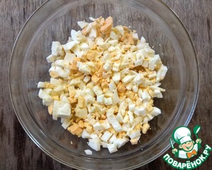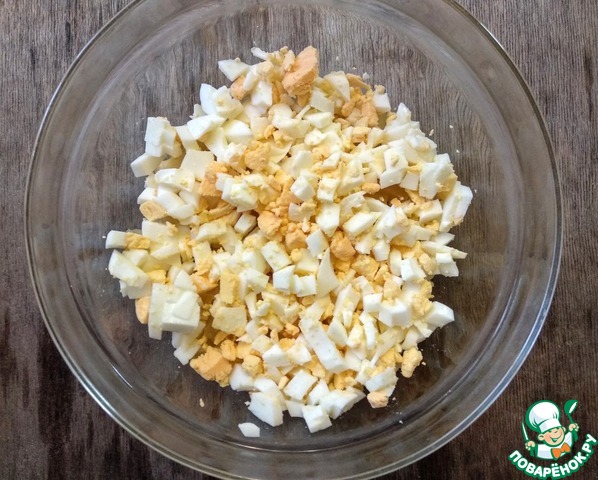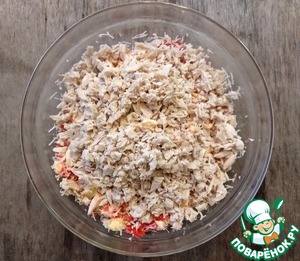 Отварное куриное филе мелко порезать. Всё хорошо перемешать, перед подачей заправить майонезом.