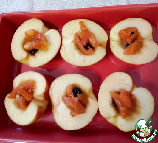Заполнить половинки яблок изюмом и порезанной курагой.