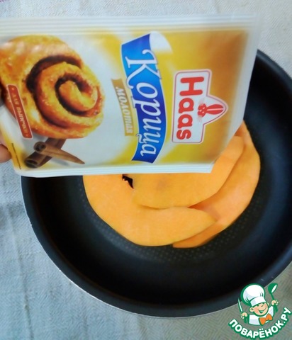 Кладем на противень, или в форму смазанную маслом. Посыпаем при желании, если тыква не очень сладкая сахаром с ванилином. Посыпаем немного корицей.