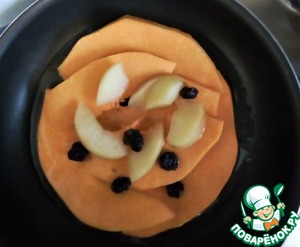 Добавляем дольки яблок и замоченный в воде или в яблочном соке с добавлением ванилина изюм.