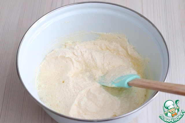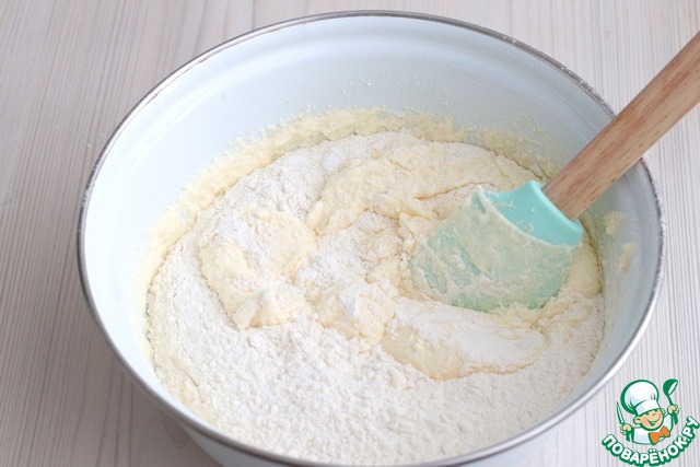 Далее постепенно добавить общее количество муки (170 гр.) и разрыхлитель (10 гр.)