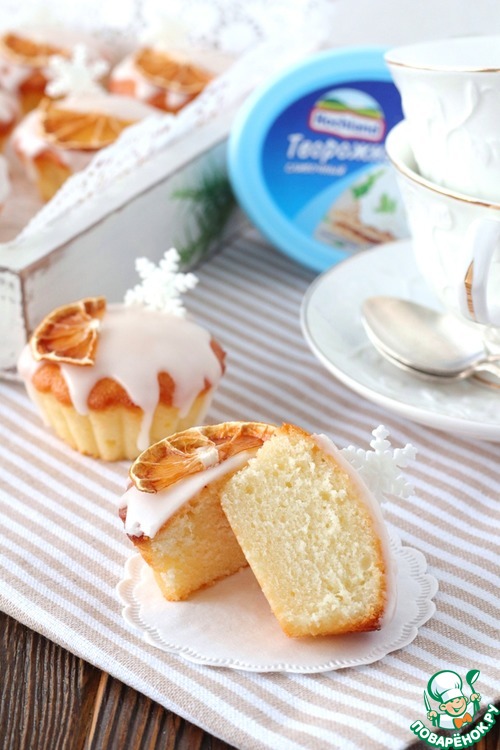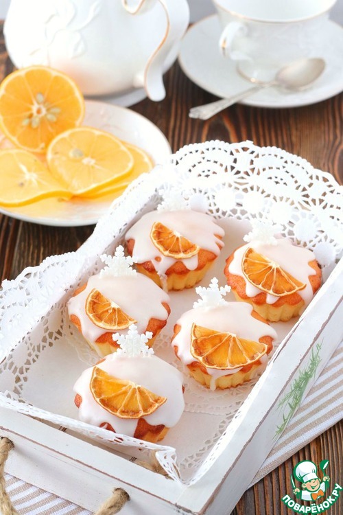 Готовые остывшие кексы полить глазурью, украсить лимонными чипсами. В качестве украшения можно приготовить снежинки из мастики, по-желанию.