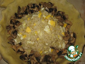 Теперь начинка. В центр, горкой выкладываем рис с яйцами и луком.