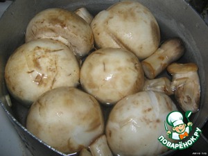 Шампиньоны отварить целиком. Потом нарезать не очень мелко.