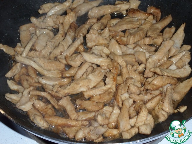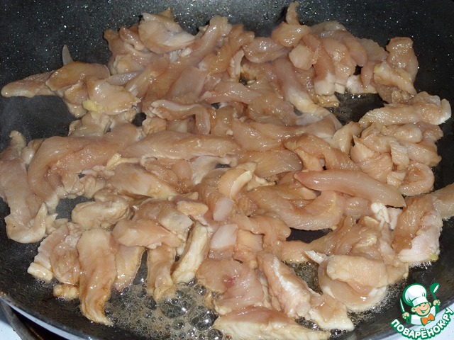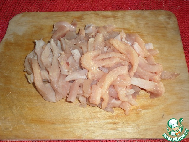Куриное мясо нарезаем соломкой и выкладываем в чашку.
