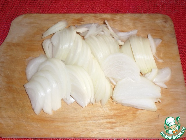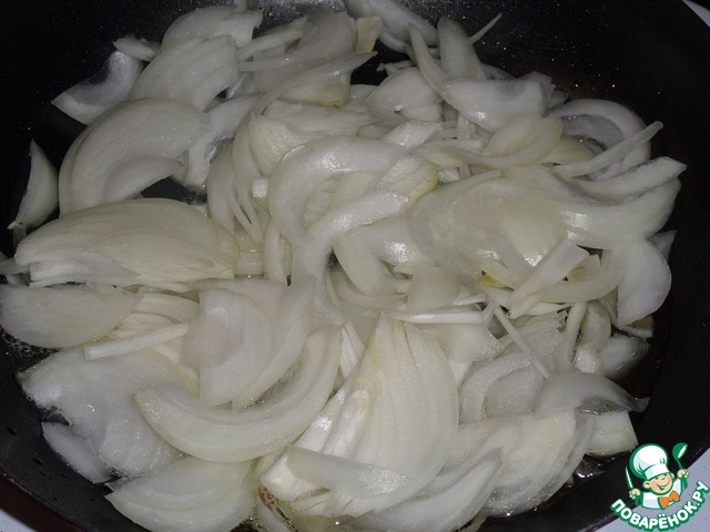 В разогретую сковороду наливаем 2 ст. л. растительного масла и выкладываем нарезанный лук.