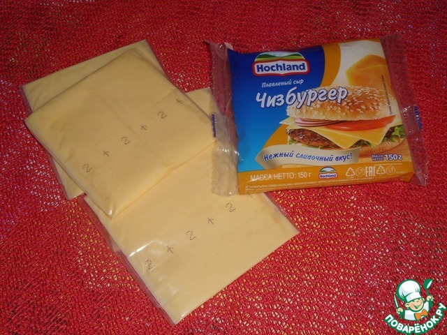 Для приготовления пирогов я буду использовать плавленый сыр ТМ TM "Hochland". Мне потребуется 4 ломтика.