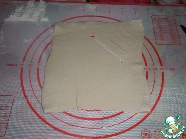 Каждую часть теста раскатываем скалкой в виде квадрата. В верхней части квадрата делаем диагональные надрезы, используя нож.