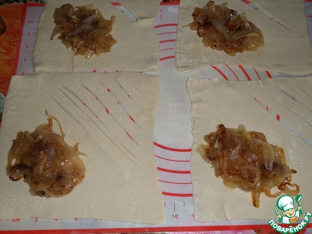 На каждый пласт теста выкладываем обжаренный лук ( примерно по 1 ст. л. ).