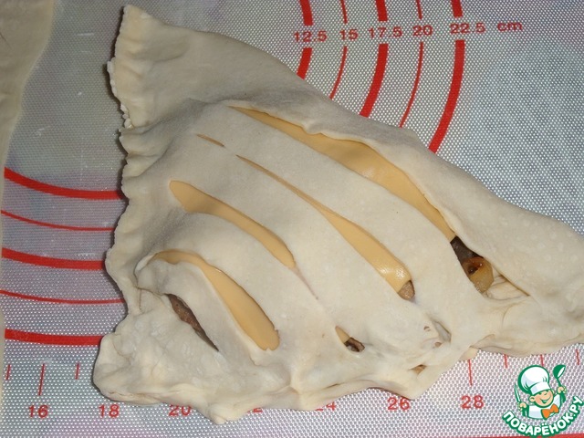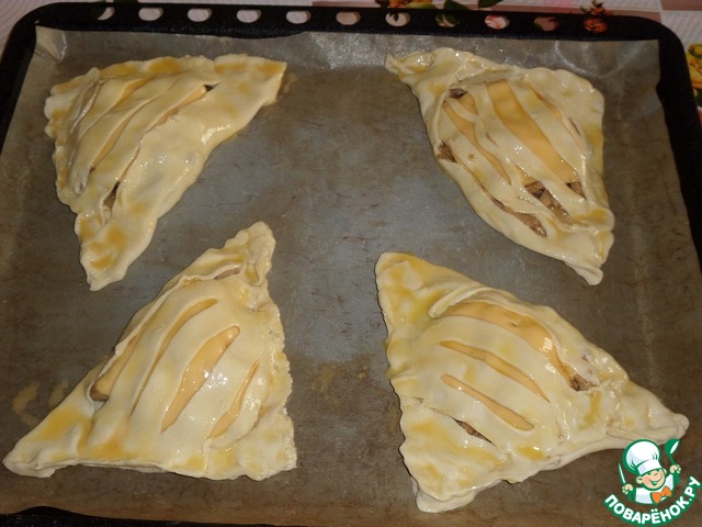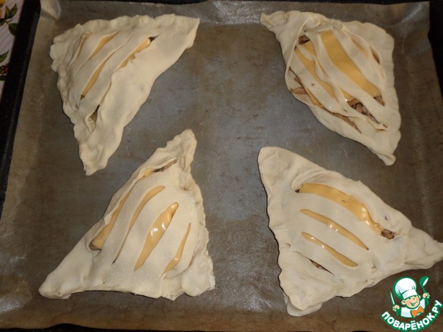 Защипываем пироги, накрывав начинку уголком теста с надрезами.