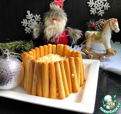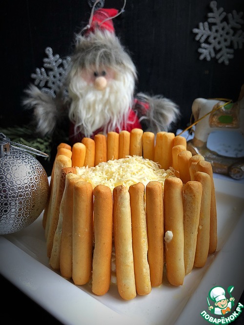 В разъемную форму для салата выложить салат, сверху присыпать натертым на мелкой терке сыром. Снять кольцо и по окружности салата выложить хлебные палочки.