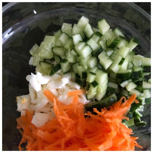 Морковь натереть на крупной терке, яйца и огурец нарезать небольшим кубиком.
