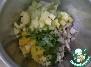 Яблоко счистим, режем кубиками, петрушку мелко рубим.