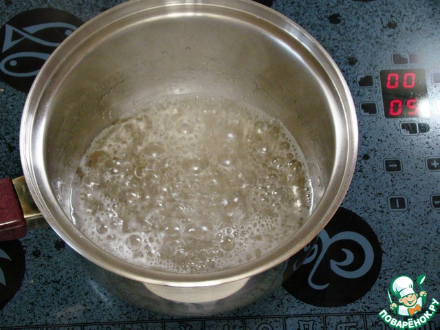 • В сотейнике смешать сахар и воду, довести до кипения и проварить сироп в течение 10 минут на медленном огне. К этому времени сироп загустеет.
