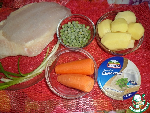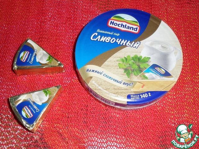 Для приготовления горячего блюда я буду использовать плавленый сыр TM"Hochland". Мне потребуется 4 кусочка.