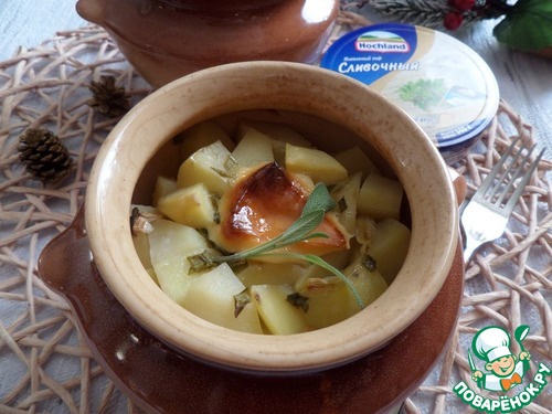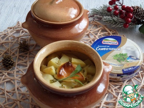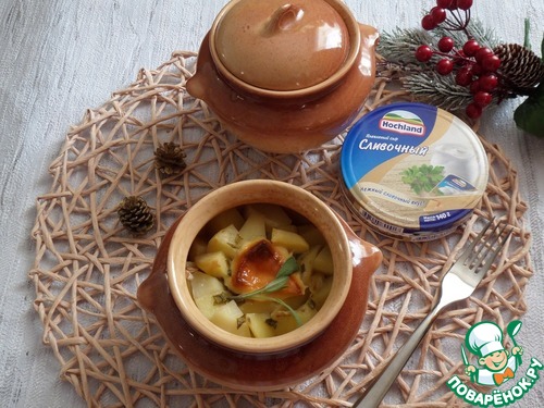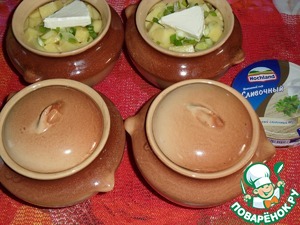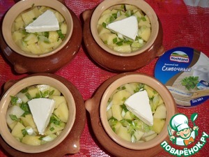 В каждый горшочек кладем нарезанный зеленый лук и кусочек плавленого сыра TM"Hochland".
