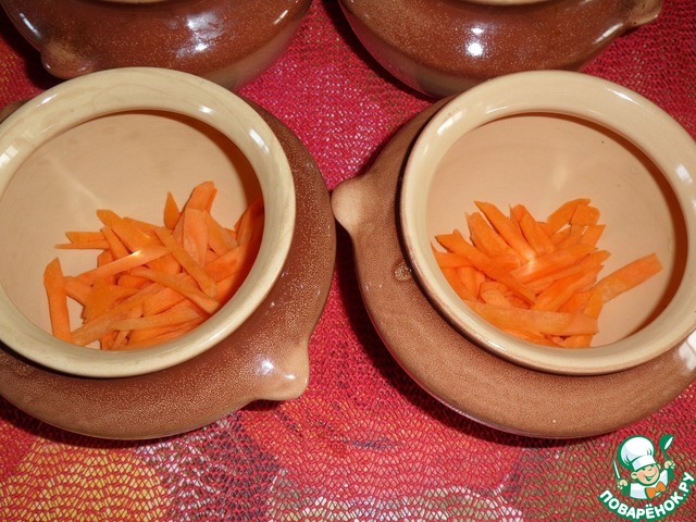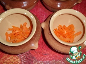В каждый горшочек наливаем по 1 ч. л. растительного масла и выкладываем морковь. Равное количество моркови в каждый горшочек.