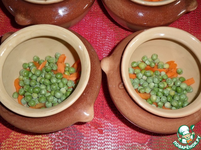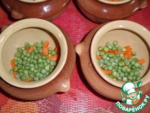 Затем в каждый горшочек добавляем по 1 ст. л. замороженного зеленого горошка.