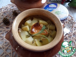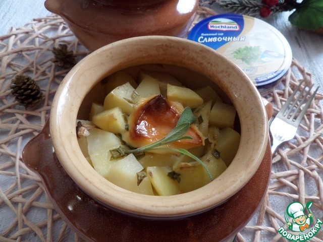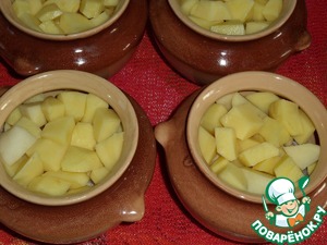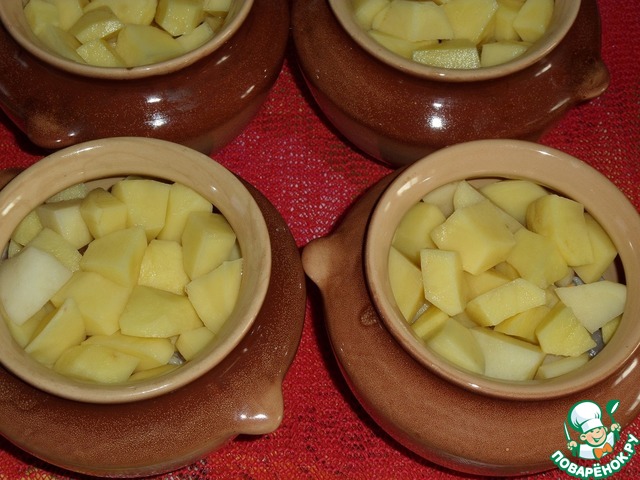 Затем раскладываем в горшочки нарезанный кубиком картофель. Солим по вкусу.