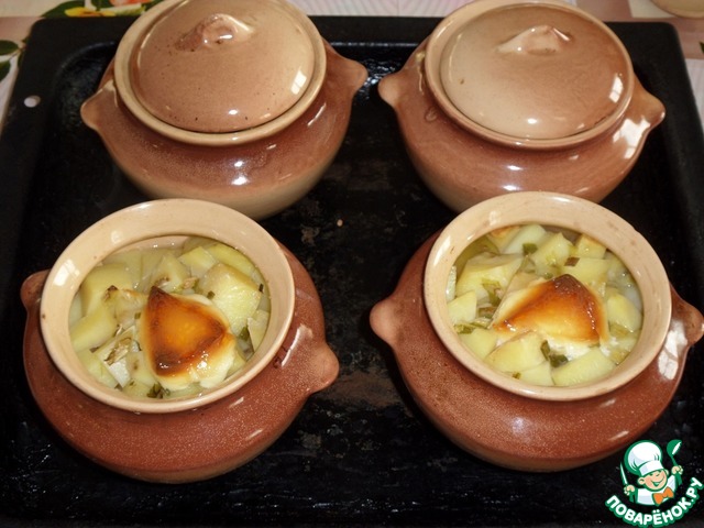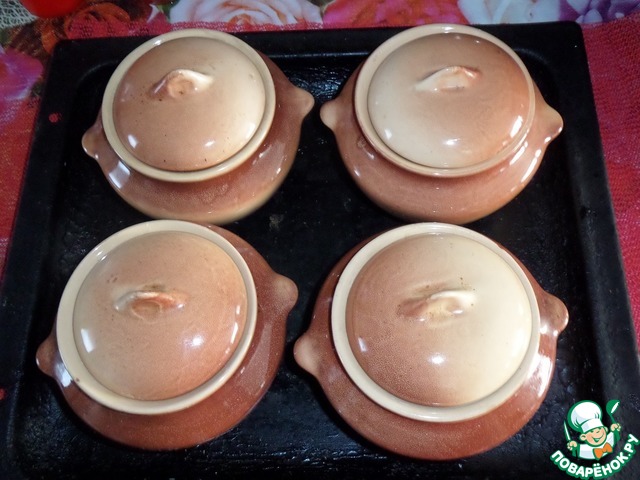 Добавляем в каждый горшочек по 2 ст. л. воды. Закрываем горшочки крышечками.