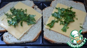 На панель положить ломтики батона, на них пластинку сыра, рубленую зелень.