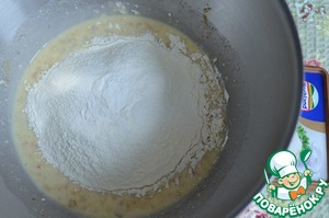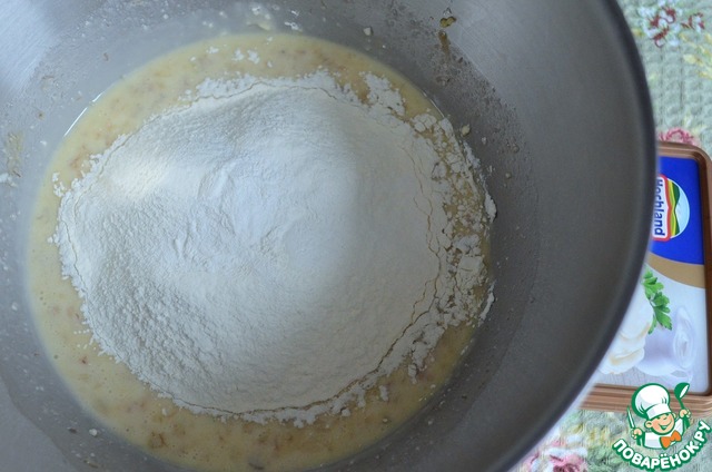 Добавить просеянную муку и разрыхлитель, тесто как густая сметана, при необходимости добавить чуть-чуть муки.