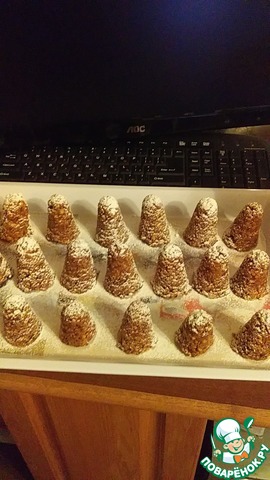 Уж сколько я переделала "Муравейников", пока дети росли, а также в подарок в гости! Но порционные в виде ёлочек не довелось и вот... новогодняя тема: будем пробовать! Ёлочки не простые, а под шапочкой сахарной глазури. Делала за два дня: замесила тесто, отправила в заморозку, на след. день-выпекала стружку и формировала ёлочки. За идею спасибо Эгине! Вышло 9 ёлочек, для большого торта увеличивайте тесто вдвое.
