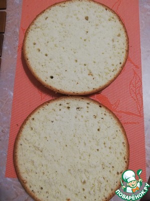 Готовый бисквит разрезать на 2 части. Вот такой нежный и мягкий он получается.