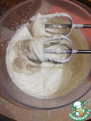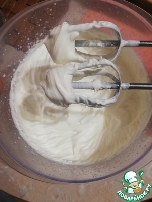 Затем добавить сахар и взбить массу до побеления и увеличения в объёме в несколько раз. Обычно это занимает 10-15мин минут в зависимости от мощности миксера.