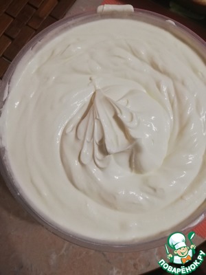 Для крема смешать в большой ёмкости пастообразный творог, йогурт, сметану, персиковый сироп. Если Вы будете использовать обычный творог, то обязательно хорошенько разотрите его в блендере. В идеале конечно же нужно использовать именно пастообразный однородный без крупинок творог. Отдельно взбить сливки с сахарной пудрой до крепких пиков.