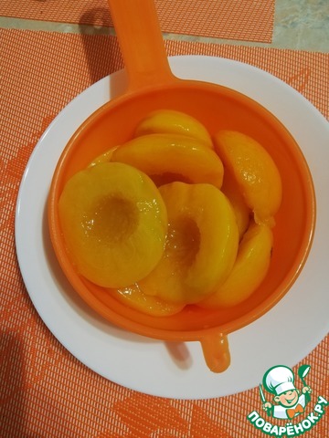 - Персик (консервированный, у меня банка 820 г) — 1 бан.