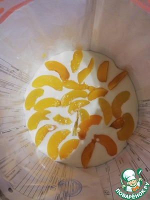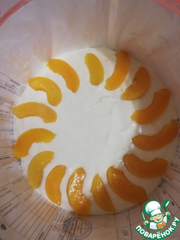 Затем сверху кладём второй корж и выливаем оставшийся крем. Поверх кладём оставшиеся персики. Убираем в холодильник до застывания и стабилизации на несколько часов, но лучше всего на ночь.