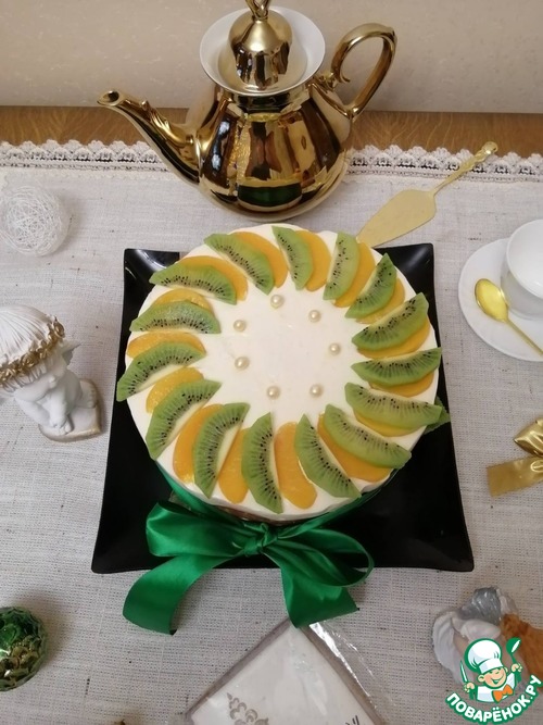 Застывший торт аккуратно освободить от кольца и украсить по своему вкусу и желанию. Важный момент-уточнение!!! Я использую для приготовления крема персиковый сироп, который используется для приготовления мороженого, коктейлей. Использовать сироп из банки нельзя, потому что он просто сделает крем жидким!!! Если у Вас нет сиропа, то лучше добавьте сахарную пудру, но ни в коем случае ни компот из-под персиков!!!