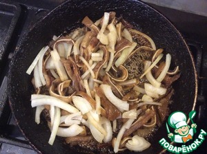 Обжаривать на небольшом количестве масла. Добавить нарезанный лук.