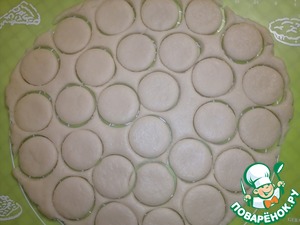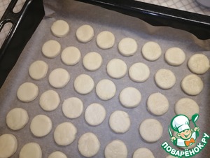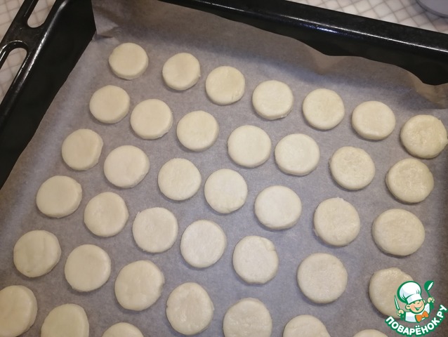 • Противень застелить пергаментной бумагой. Переложить вырезанные кружки. Отправить в заранее разогретую духовку на 180° на 15 минут. Ориентируйтесь на свою духовку.