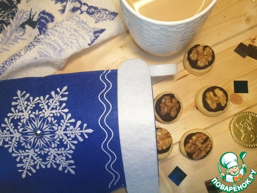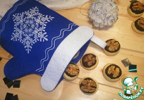 • На водяной бане растопить шоколад со сливками. Нанести шоколад на остывшее печенье. Сверху кладём половинку грецкого ореха. Готово.