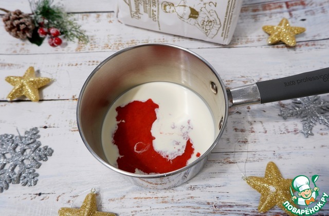 Желатин залить холодной водой. 130 гр. сливок совместно с глюкозным сиропом и клубничным пюре подогреть до температуры 60°С. Далее добавить желатин, затем растопленный шоколад, взбить блендером. Охладить до температуры 40°С и добавить оставшиеся 140 гр. сливок.