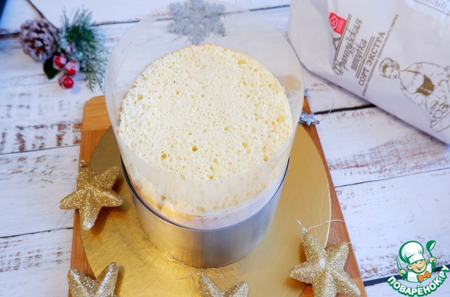 По готовности, бисквит остудить, затем вынуть из кольца, завернуть в пищевую пленку и отправить в холодильник на 8 часов.