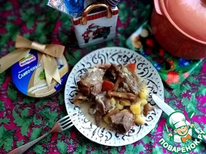 Жаркое из баранины, опят, сыра и сливочного масла с овощами в горшке.