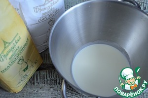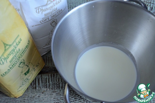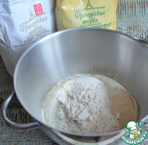 Просеять оба вида муки, добавить в сливки муку, сахар и дрожжи. Смешать.