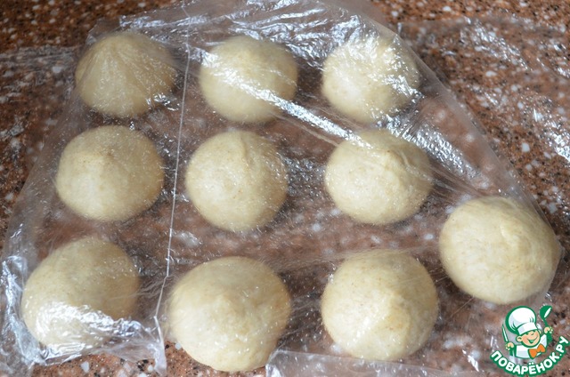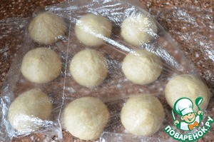 Разделить на 10 одинаковых частей, подкатать в колобки, накрыть. Дать "отдохнуть" 10 минут.