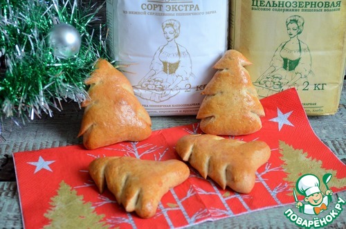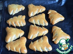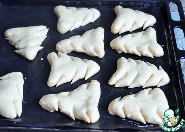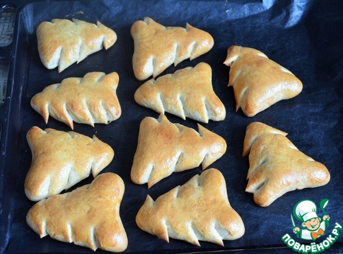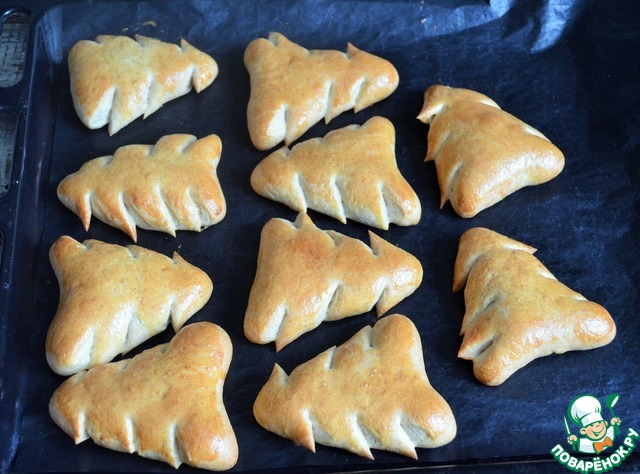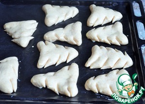 • Через 25 минут заготовки надрезать ножницами, имитируя ветки ёлок. Смазать смесью желтка и молока.