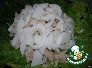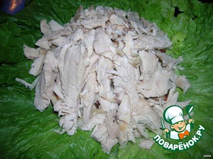 Далее резанное тонкими полосками филе варёной курицы, я брала грудку.