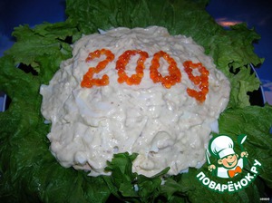 Далее украшаем салат. Тут мне на помощь пришёл муж, посоветовал, красной икрой сделать надпись "2009".