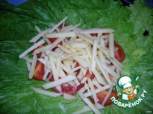 Сверху помидорок укладываем резанный тонкими полосками сыр.