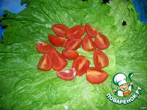 На листья салата кладём резаные пополам (если крупные, то на 4 части) помидорки черри.
